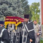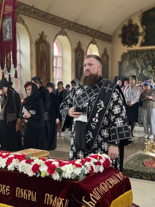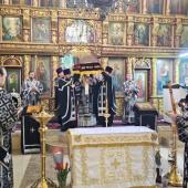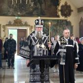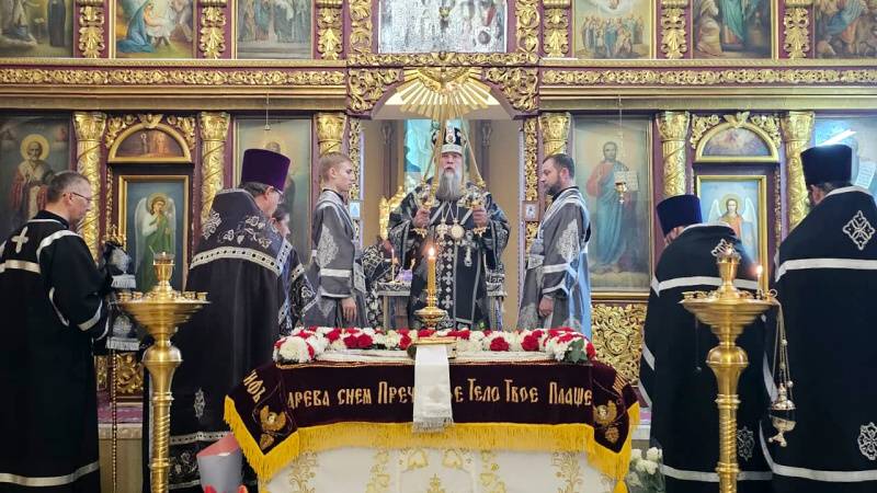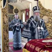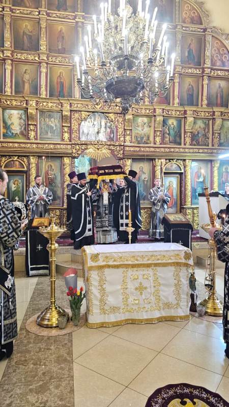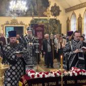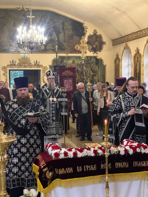 На вечерне, когда вспоминается снятие Тела Господа Иисуса Христа и приготовление Его к погребению, владыка Клавдиан с духовенством вынесли и положили в центре храма Святую Плащаницу с изображением умершего Спасителя.